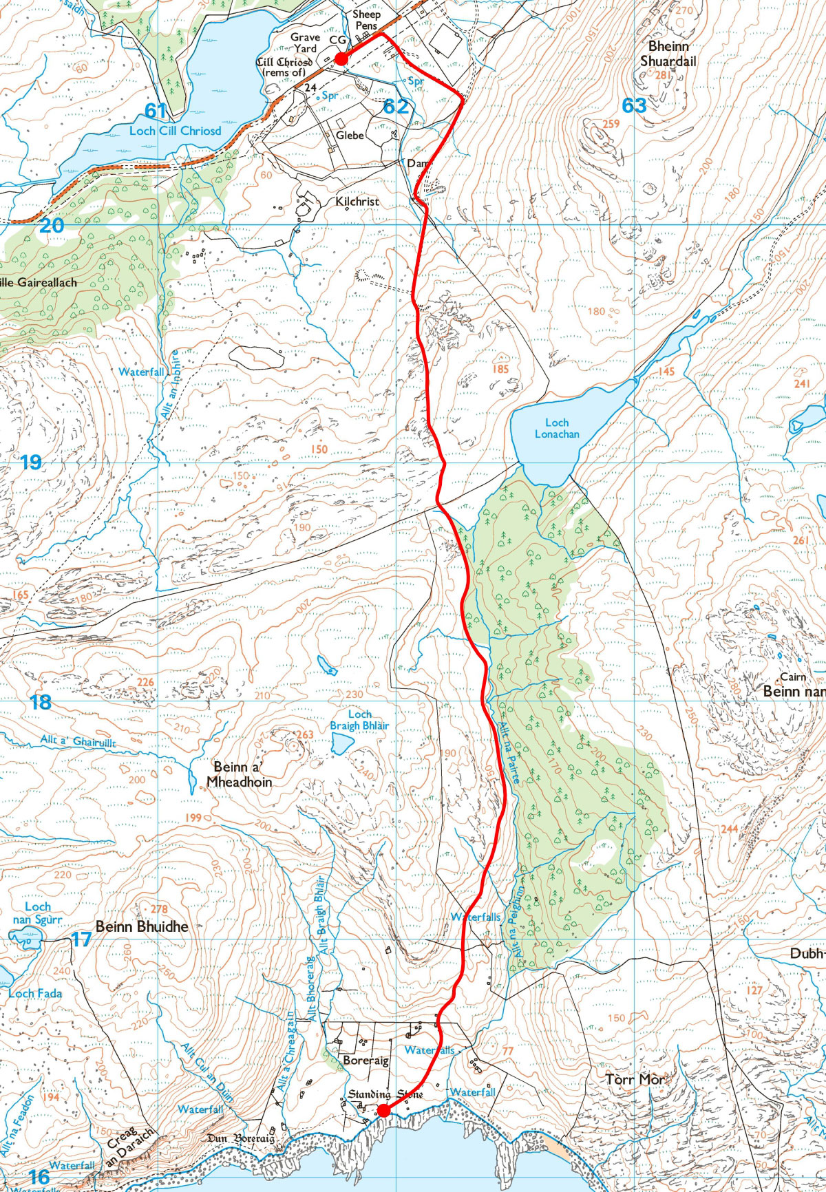 The walk Starts at the ruined church of Kilchrist (Cill Chriosd) on the road from Broadford to Elgol. The first section of the walk passes the industrial remains of an old railway platform and marble quarry, then over the hillside to Boreraig. It covers a distance of 10km for the round trip and takes an average of 1 hour 30 minutes each way (3 hours of walking).